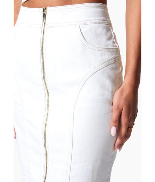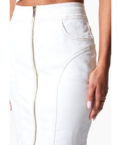 Stay stylish in the Bebe Women’s Contrast Stitching Zip Up Denim Skirt in White Denim Wash. This casual yet feminine skirt features a front zipper detail, contrast seam-stitching, and four pockets. Pairs well with the matching Zip Up Denim Top. Made of 98% Cotton and 2% Spandex. Delicate machine wash. Model is 5’9″ and wears a US size 26 with a length of 19″.