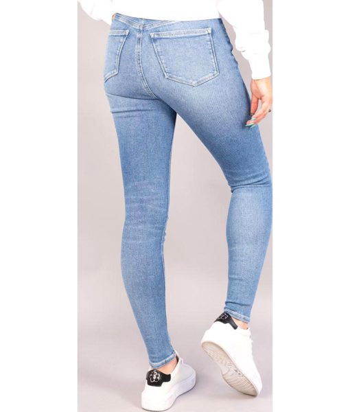 The denim light Calvin Klein Jeans High Rise Super Skinny Ankle Jeans boast a trendy and sustainable design, made with 20% recycled cotton. The jeans feature contrasting white branding on the waistband and have a high waist and slightly cropped ankle, providing a chic and stylish look.