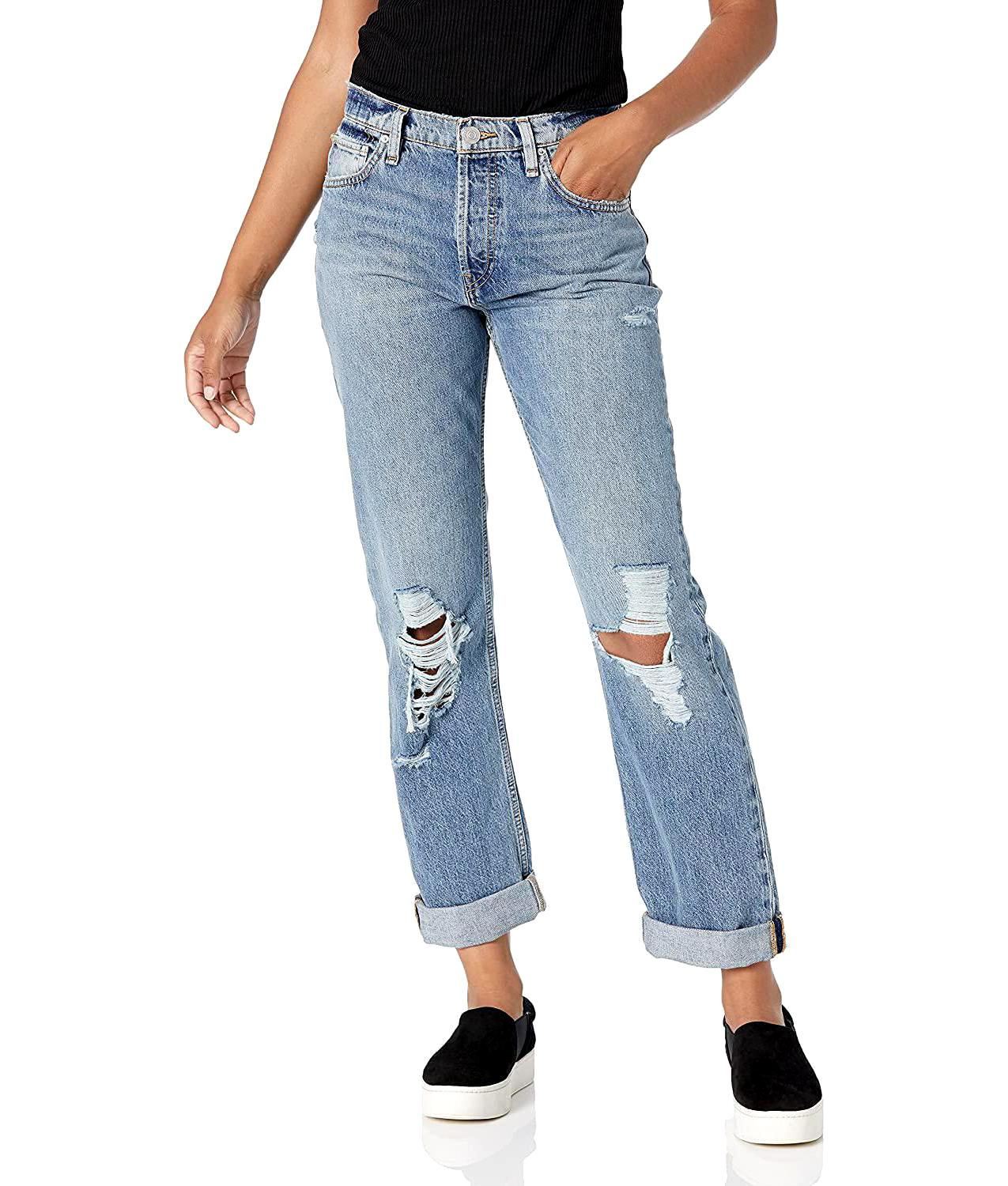 The Thalia Cropped Boyfriend Jean boasts an 11 inch rise, untacked cuff at the hem, and a distressed denim finish for a stylish, laid-back look.
