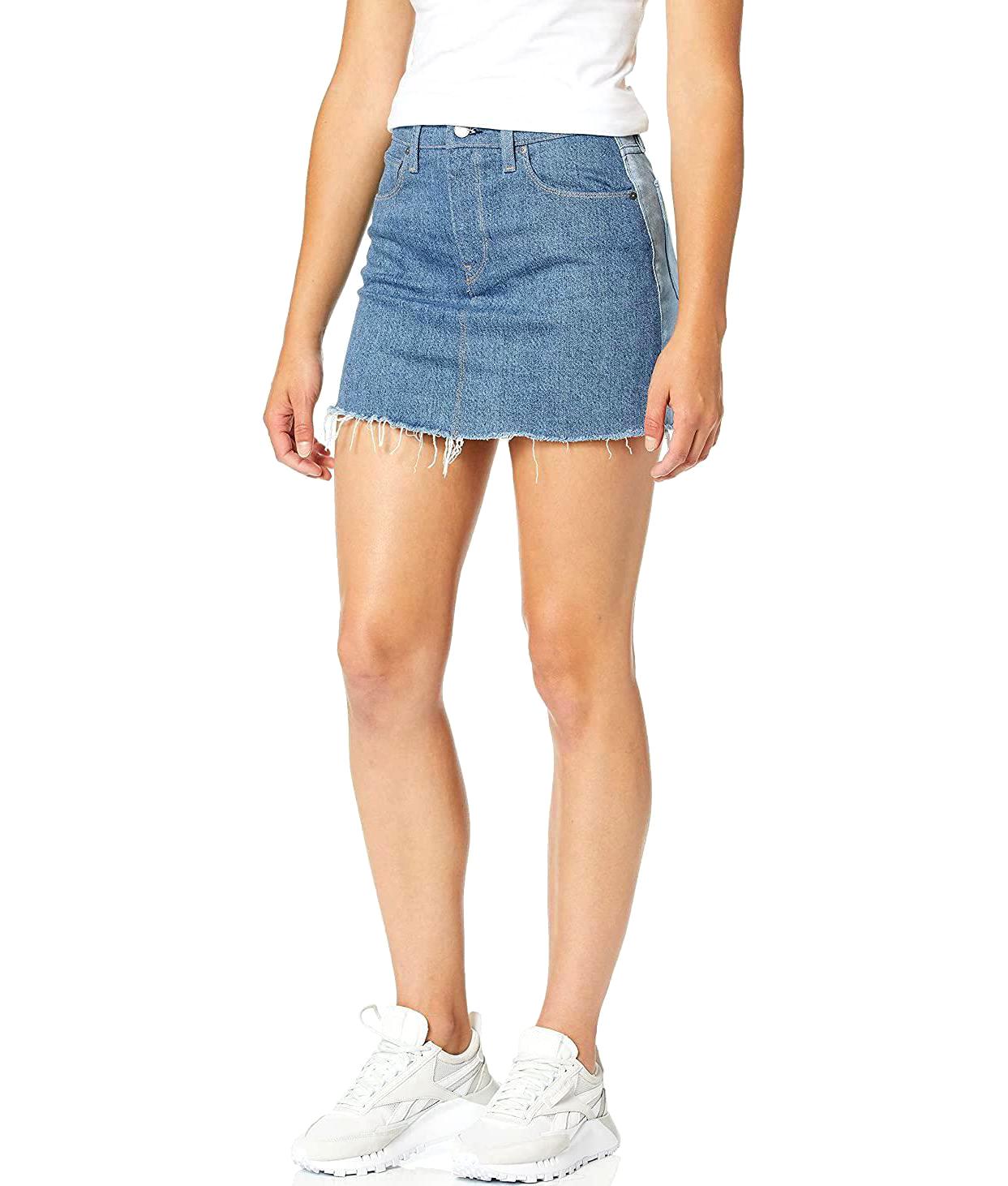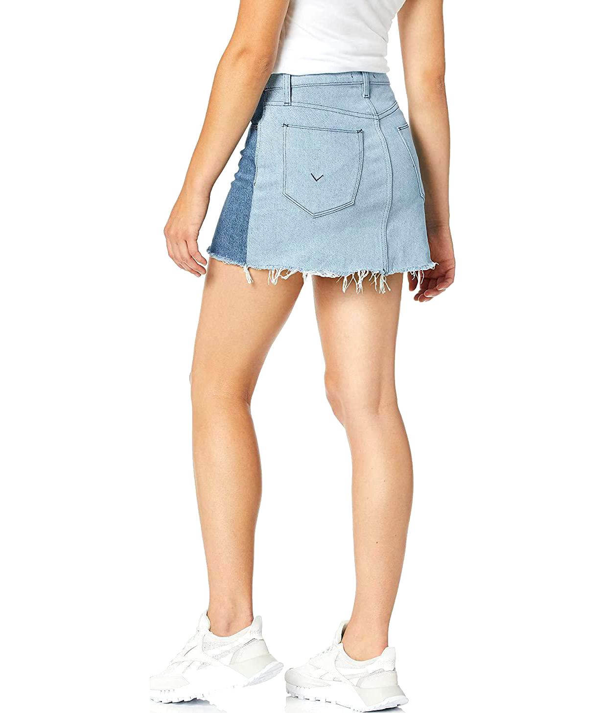 The HUDSON Jeans Viper Denim Mini Skirt in Jet Set is a light blue wash and has a traditional 5 pocket detailing. It has a 40 inch sweep and a 14 inch length.