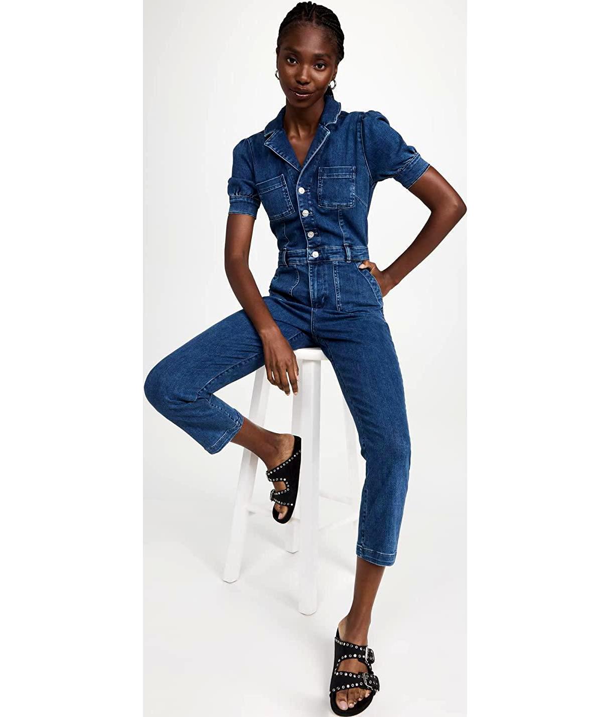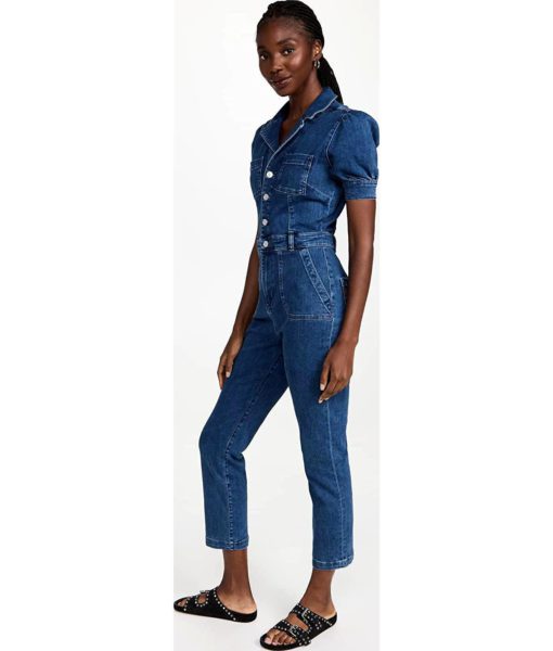 This jumpsuit is made from heavyweight stretch denim and has a collared neckline with notched lapels, a button placket and zip fly, short puff sleeves with button cuffs, and patch front and back pockets. It has an inseam of 28 inches and a leg opening of 14.25 inches.